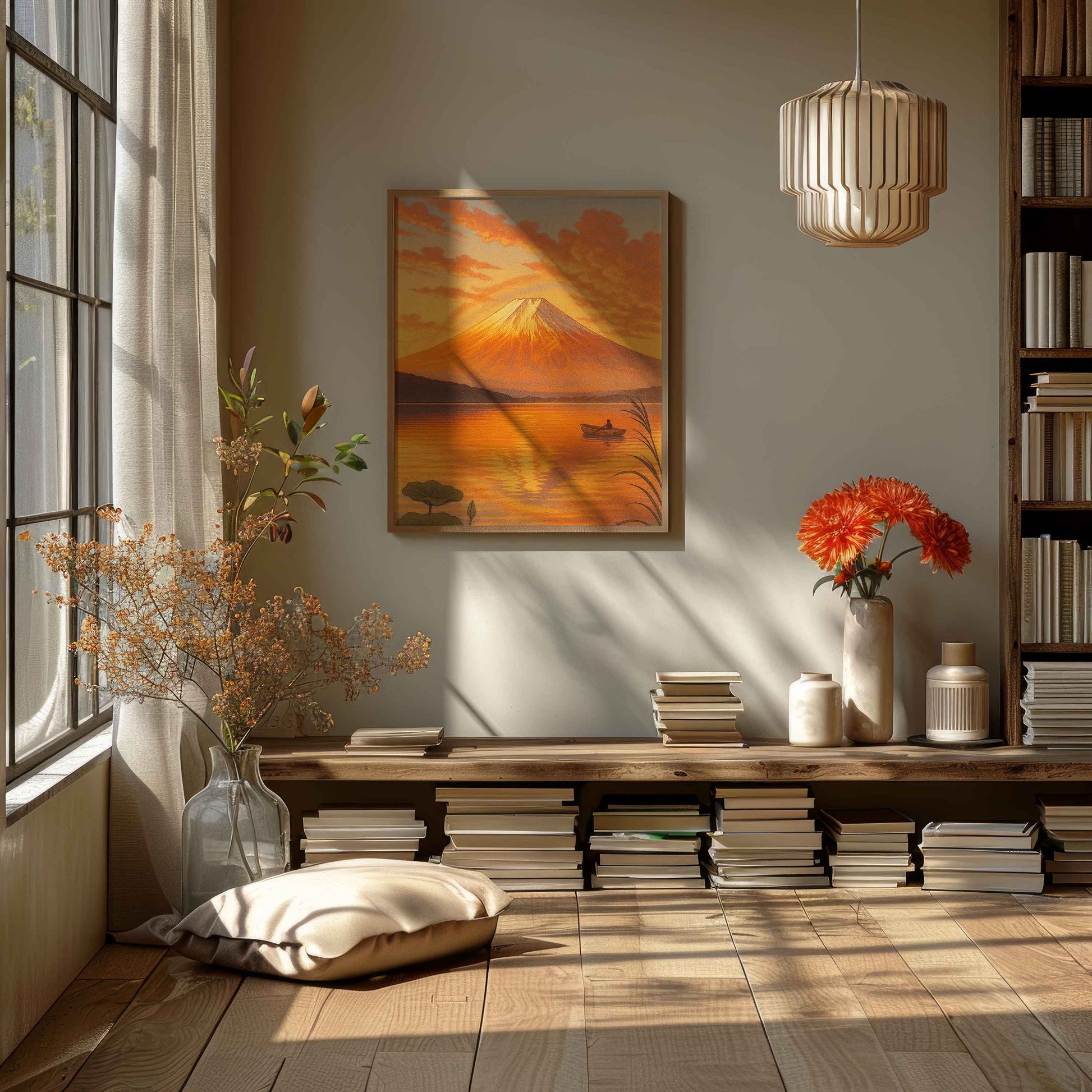 The print, "Fuji's Golden Hour," is an essential piece in our Evergreen Collection, capturing one of Japan's most revered views during a moment of spectacular light. The majestic Mount Fuji is bathed in intense, fiery orange and gold, reflected perfectly in the serene waters below, where a lone figure in a small boat adds a quiet human element to the vast, luminous scene.
