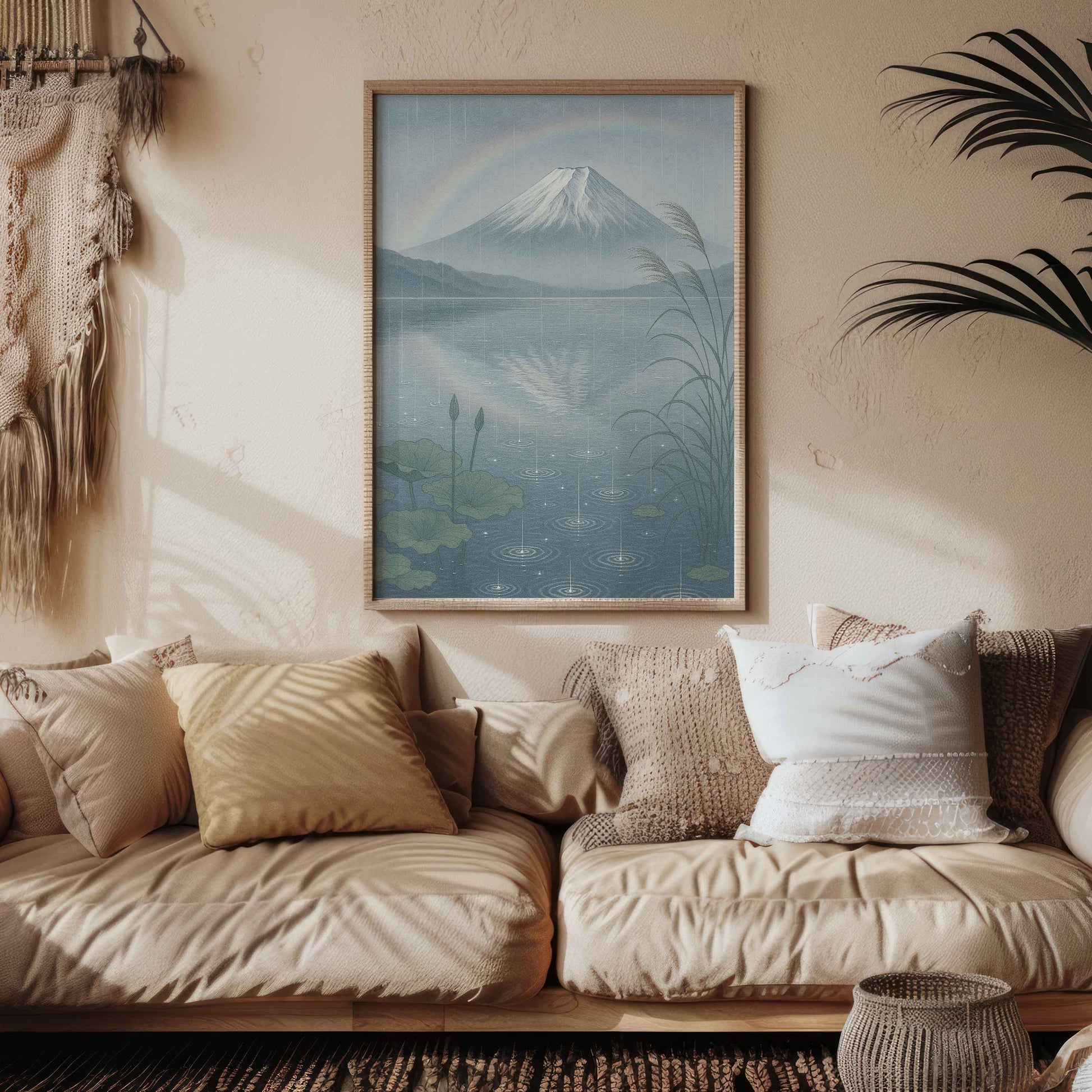 The print, "Ephemeral Grace," is a powerful and unique addition to our Evergreen Collection, capturing the fleeting beauty of a rainbow arcing over Mount Fuji during a soft rainfall. The scene is saturated with cool, calming tones—the deep blues of the water, the gentle grey of the rain, and the momentary burst of color in the sky. The mesmerizing circles of raindrops on the water's surface create a hypnotic, rhythmic effect, conveying a sense of profound calm and reflection.