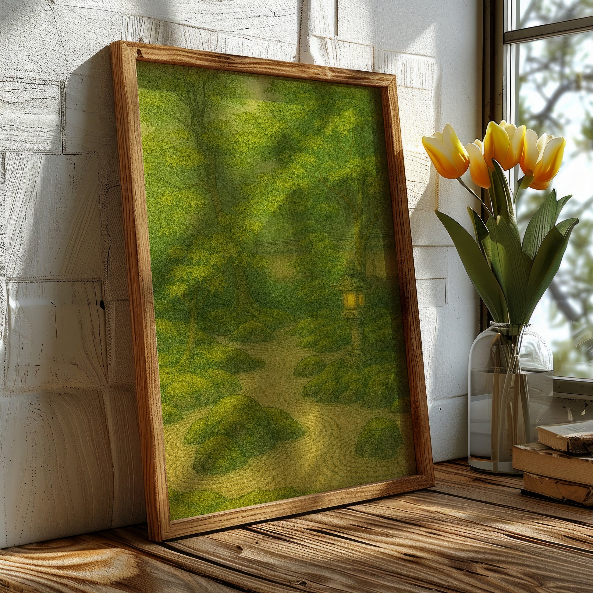 The print, "Lantern's Path," is a deeply atmospheric and serene piece from our Evergreen Collection. It captures the essence of a tranquil Japanese garden just as evening begins, with the warm light of a traditional stone lantern cutting through the surrounding lush, emerald green of the moss and maple foliage. The meticulously raked sand flows around mossy stones, creating a meditative visual pattern of continuous stillness and harmony.