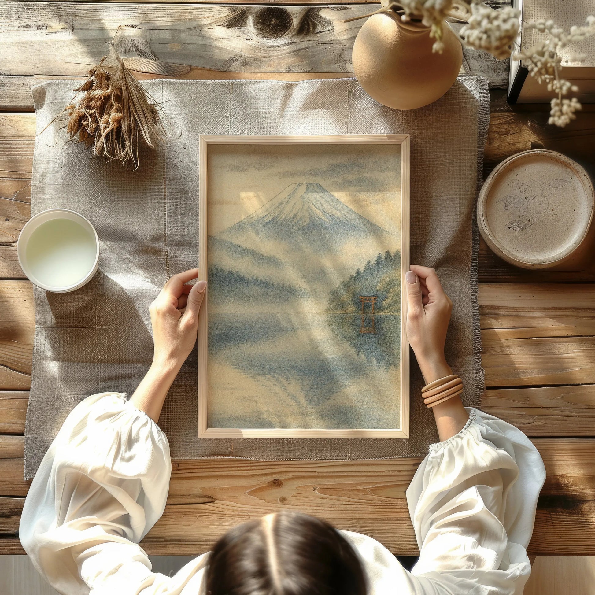 The print, "The Sacred Threshold," is a foundational piece in our Evergreen line, revered for its meditative atmosphere and classic Japanese composition. It beautifully captures a moment of sublime quietude: the majestic, snow-capped Mount Fuji rises through the clearing morning mist, its presence reflected flawlessly in the deep, undisturbed lake below. A single Torii gate stands sentinel at the water's edge, inviting contemplation and marking the transition into a sacred, tranquil space.